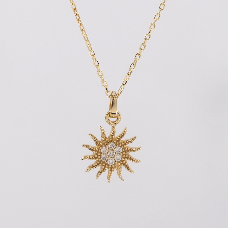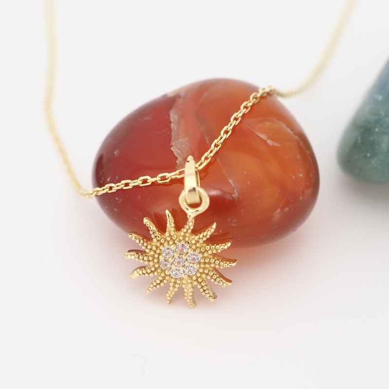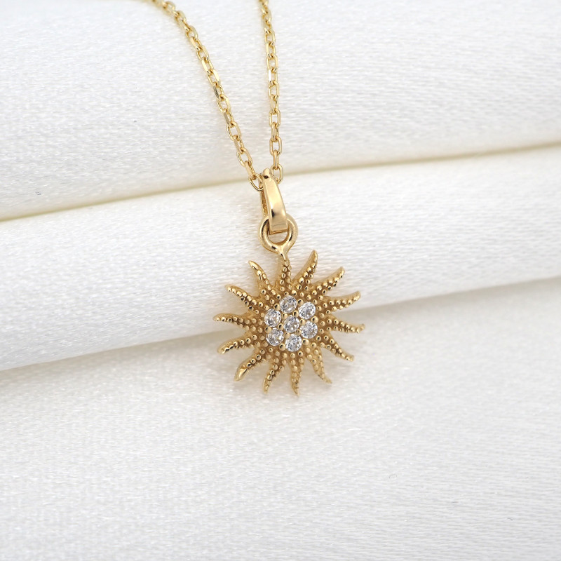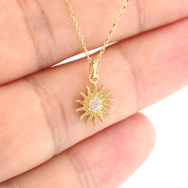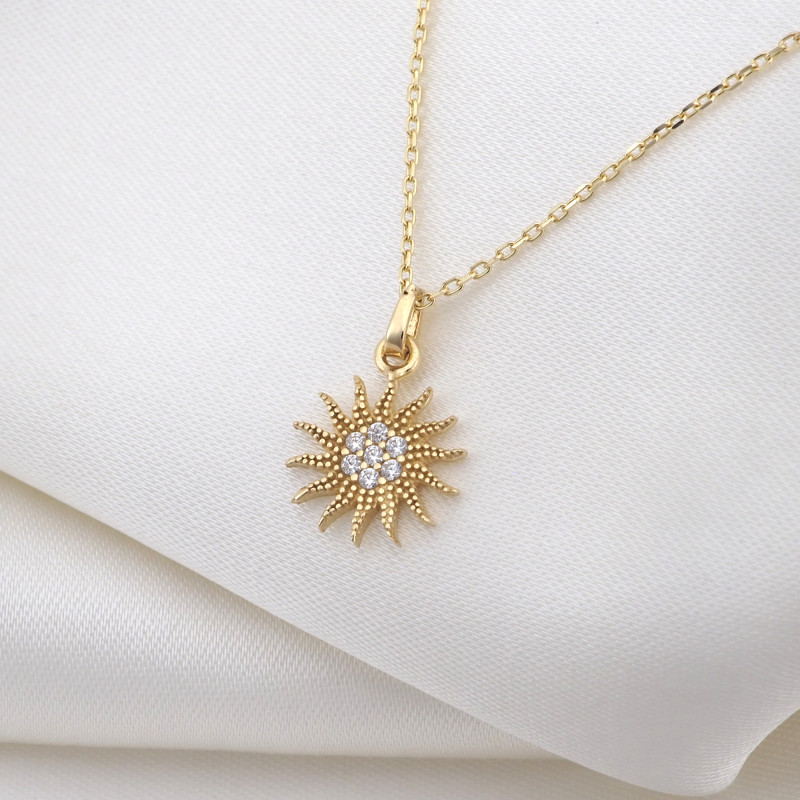 Güneş formunda tasarlanan altın kolye ile günün aydınlığını ve pozitif enerjisini her an yanınızda taşıyın. Zarif ve minimalist 14 ayar altın güneş kolye, sade tasarımıyla göz doldurur. 1,46 gram ağırlığında hafif bir modeldir. 42 cm uzunluğundaki zincir ile birlikte sunulan bu kolye, ister günlük kullanımda ister özel anlarınızda şıklığınızı tamamlar. 9x9 mm boyutundaki narin güneş motifi kolye, hem tek başına hem de diğer kolyelerinizle katmanlı bir görünüm oluşturmak için idealdir. Sevdiklerinize anlamlı ve ekonomik hediye arıyorsanız, bu zamansız parça harika bir seçim olacaktır.