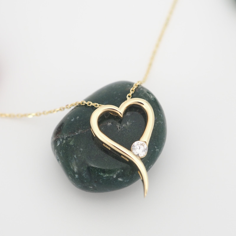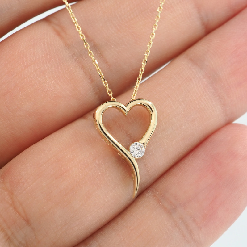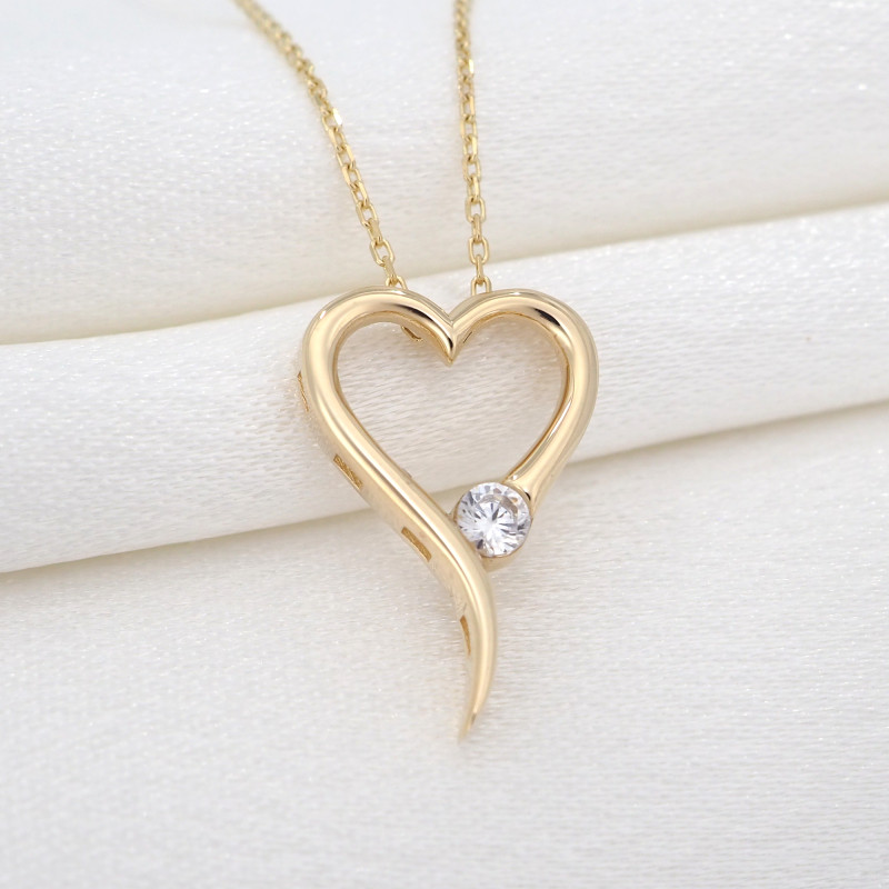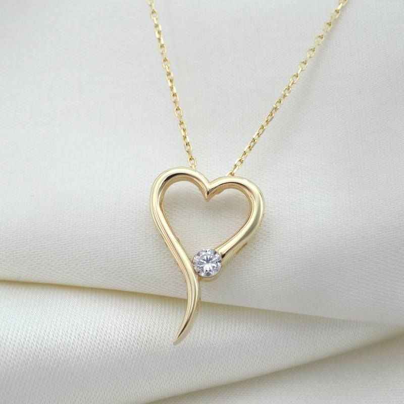 Aşkın ve zarafetin en sade hali: 14 ayar altın tektaş kalp kolye. Kalp formunda tasarlanan kolye ucu, ortasında yer alan tektaş ile ışıltılı bir görünüm sunar. 11x17 mm ölçülerinde zarif uç kısmı ve 42 cm uzunluğundaki ince zinciriyle boynunuzda şık ve anlamlı bir detay oluşturur. Kolye toplamda 1,75 gram ağırlığındadır.