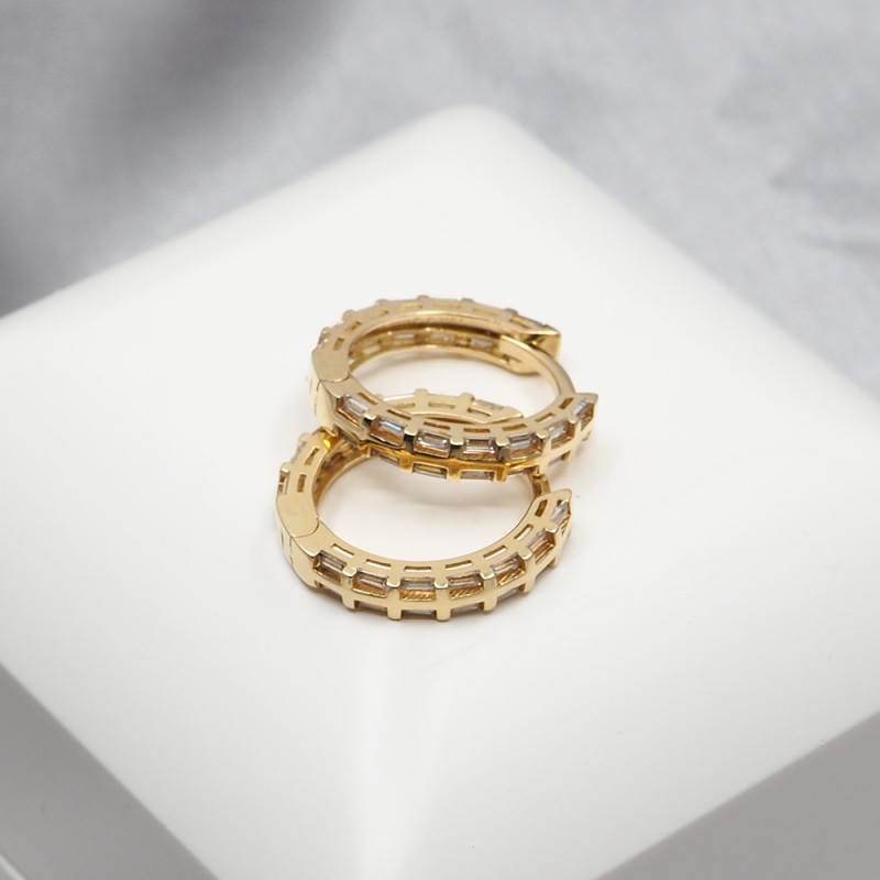 Baget kesim taşlar, yüzeylerindeki düz hatlar sayesinde altın küpelerin parıltılı ve etkileyici bir görünüm sunmasını sağlar.