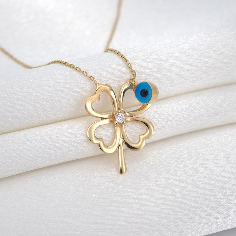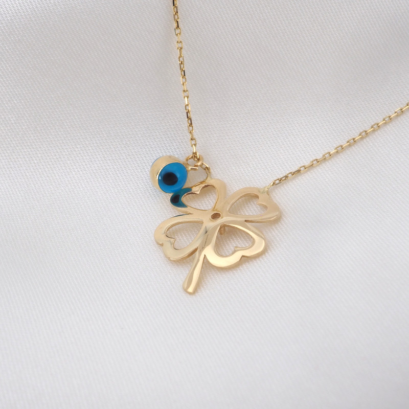 Kendi tarzınızı şans, sevgi ve zarafetle tamamlamak ya da sevdiklerinize mutluluk ve koruma dilemek için 14 Ayar Nazar Boncuklu 4 Yapraklı Yonca Kolyesi mükemmel bir seçimdir.